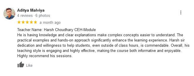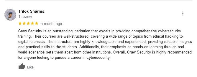 Leaving his remarkable thoughts on Craw Security in his Google Review, Mr. Trilok Sharma is doing great by learning CEH v12 Certification Training and now looking forward to joining some other courses proposed by the House of Craw Security.