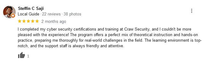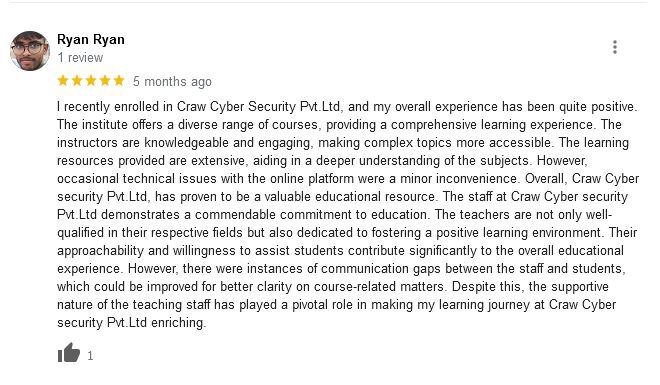 Along with his 5-star review of Craw Cyber Security, Mr. Ryan has even shared a load of words in the appreciation of Craw Security, right from the training style of his mentor to the overall learning experience he had while learning at our tech-frontier institute of cybersecurity.