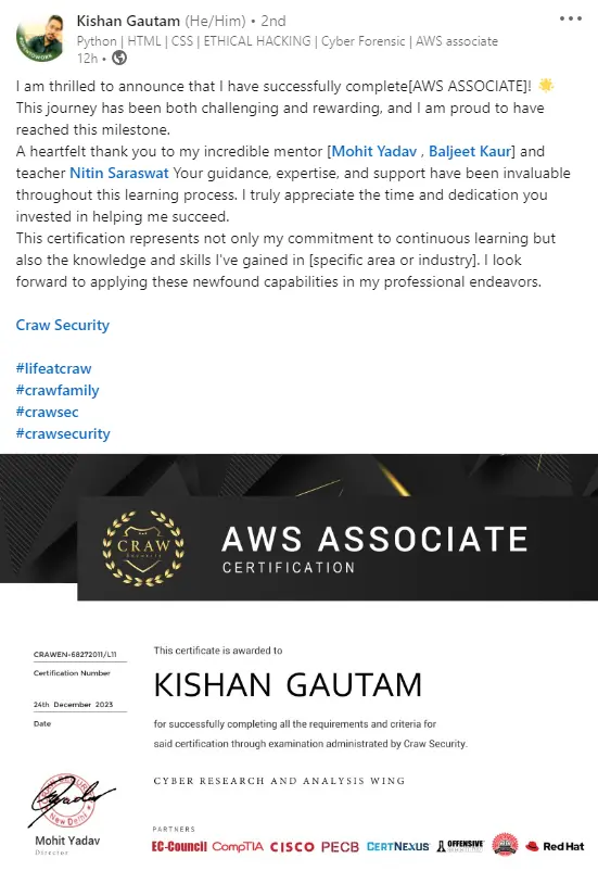 the AWS Associate Certification, designed in an elegant black and gold theme, indicating that Kishan Gautam has been acknowledged by the Cyber Research and Analysis Wing of Craw Security. The certificate lists the date of award as 24th December 2023 and includes a unique certification number. At the certificate’s footer, there are logos of partner organizations such as EC-Council, CompTIA, CISCO, PECB, CertNexus, Offensive Security, and Red Hat.
